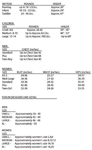- IMPORTANT: Costumes are sized differently than apparel, use the Forum Children’s Size Chart, do not choose based on child’s age or clothing size