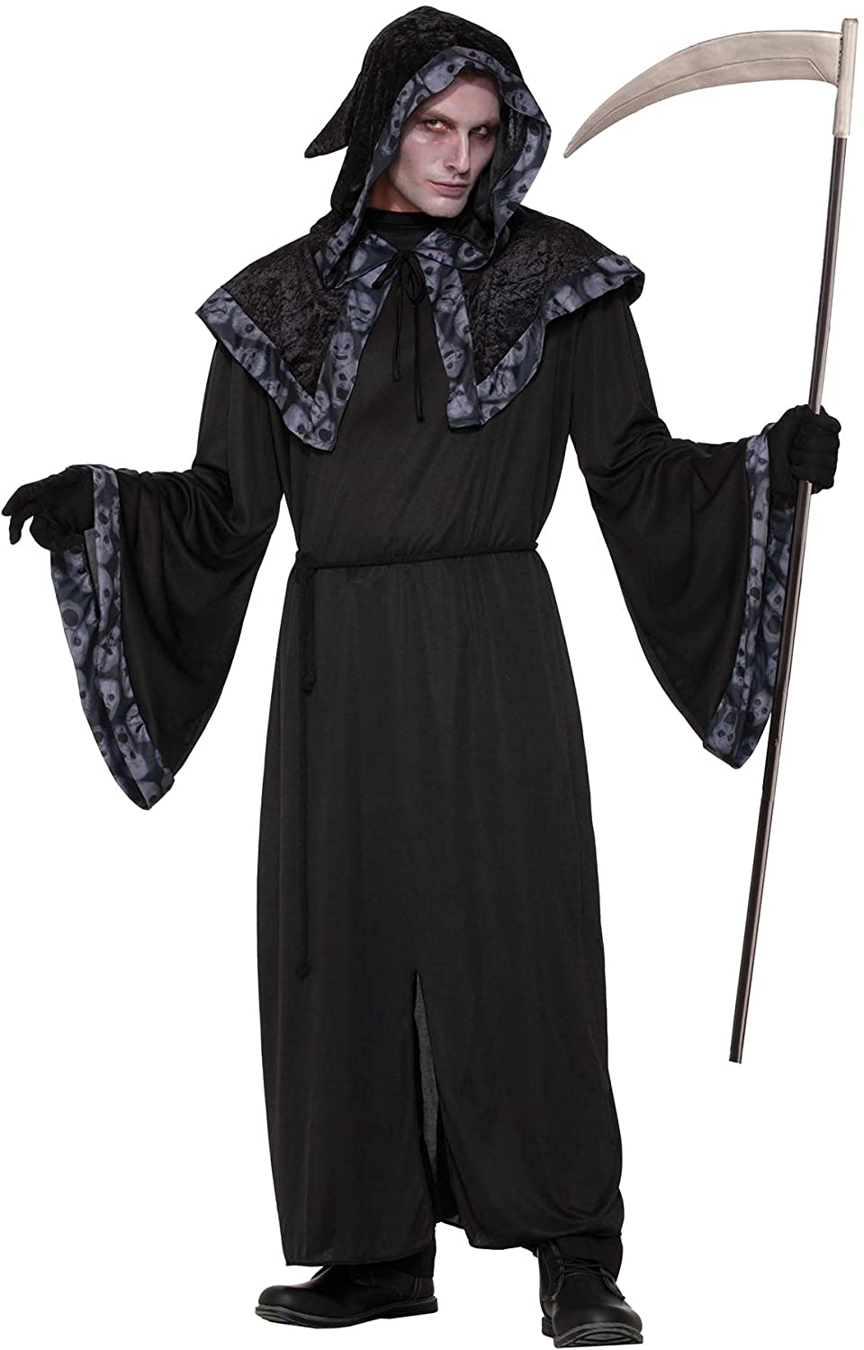 - Costume includes hooded collar, black pullover robe and black rope belt. Robe and collar feature trim with spooky spirit faces.