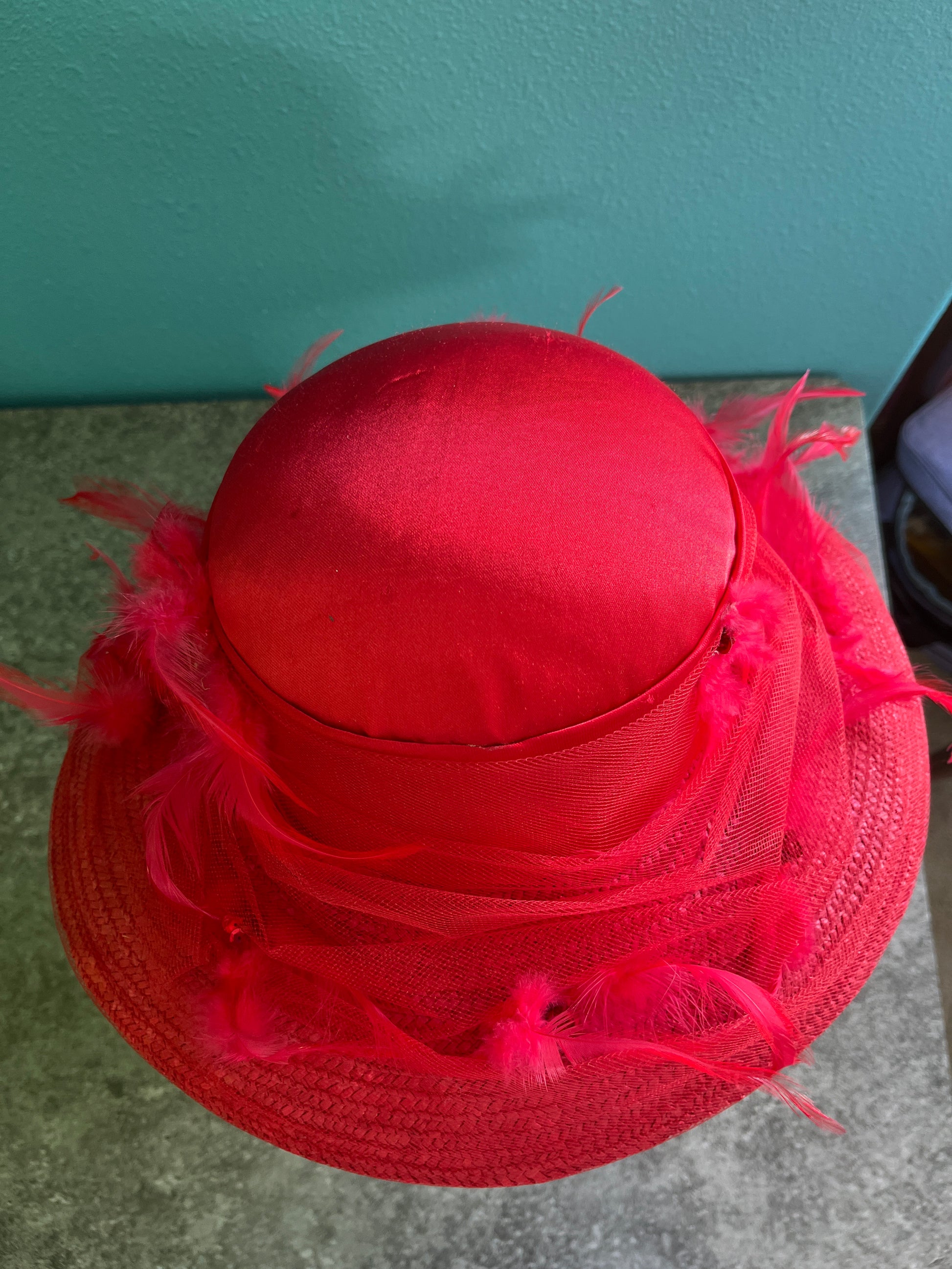 Vintage Women's Red Straw Hat Kentucky Derby Straw, Feather Satin Medium.