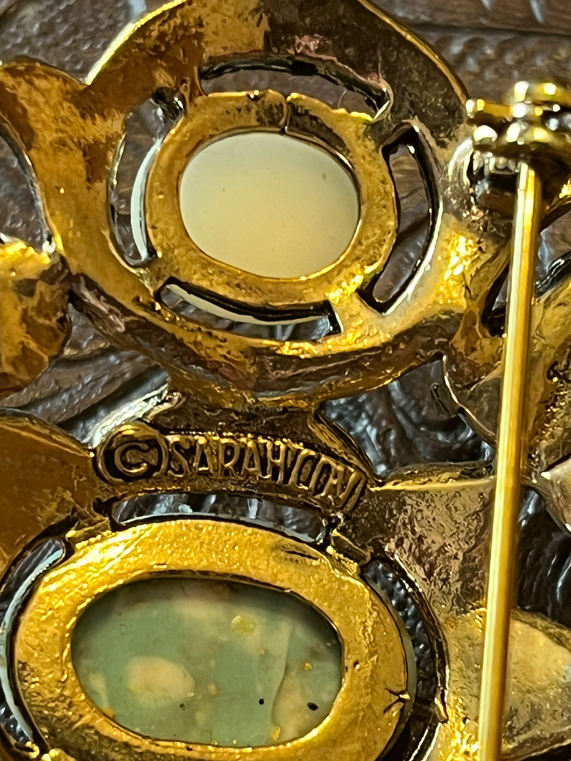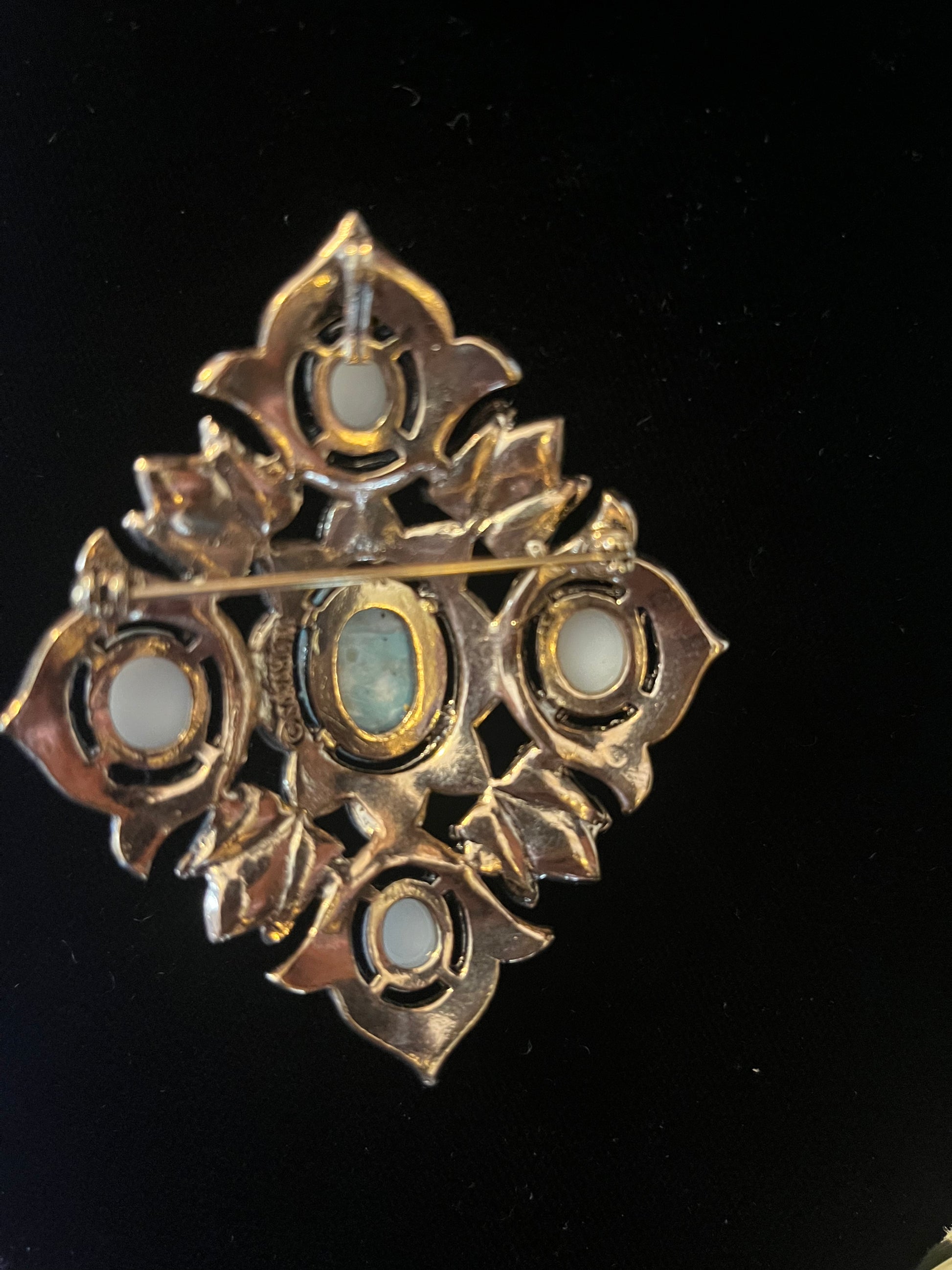 On offer is a lovely Sarah Coventry vintage brooch that also can be a pendant. The light gold metal marble-like texture that surrounds the stones makes the surface appear as though it is filled with little "diamonds." The brooch features a large turquoise cabochon stone at its center surrounded by four faux pearl cabochon stones: North, South, East & West. In between the pearls are 8 small teardrop turquoise stones, 2 stones per section. There is a pin on the back and also a hook that allows for the multiple uses of the piece. The brooch is signed "Sarah Cov" on the back. The brooch is in good vintage condition!