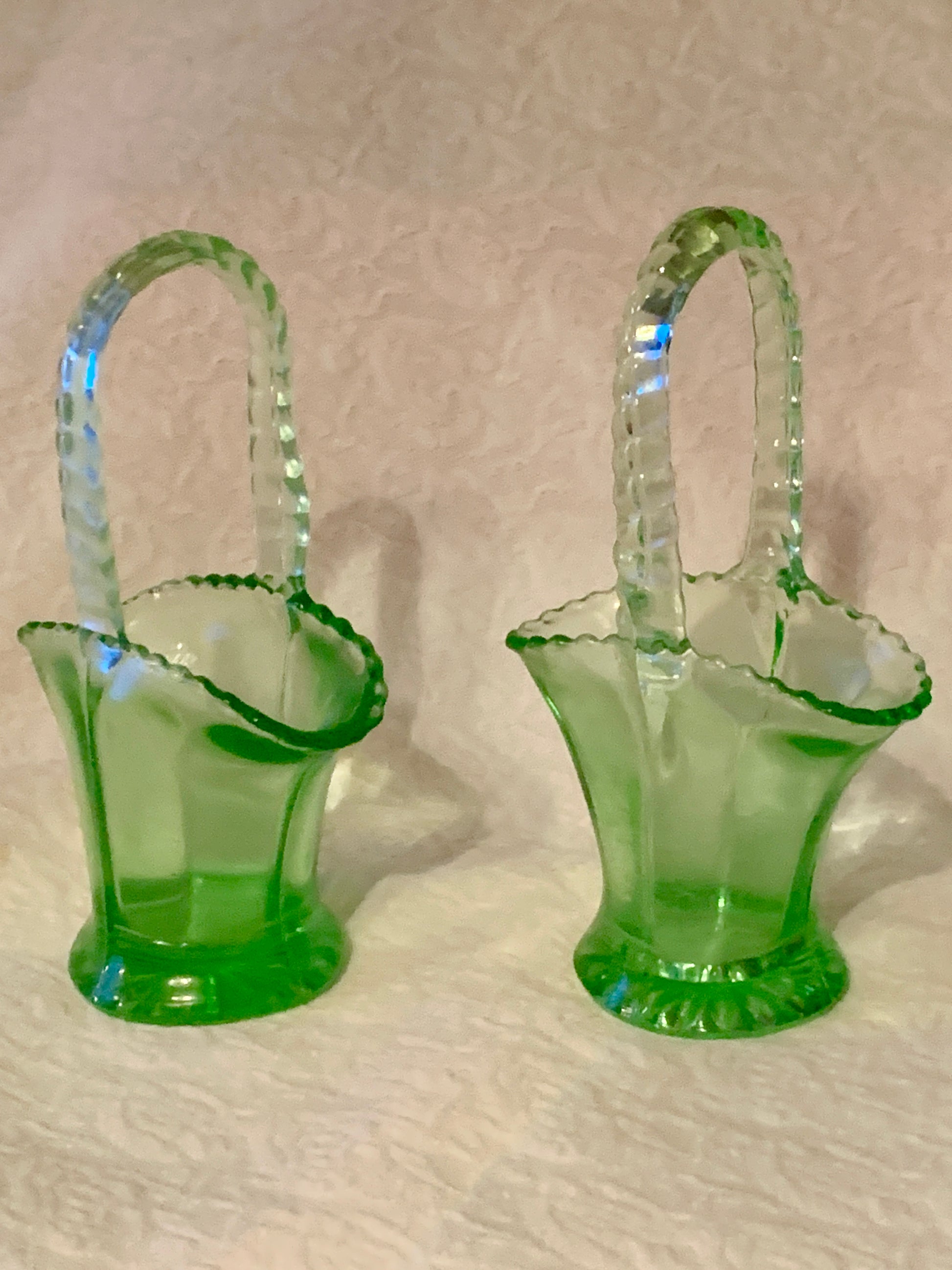 Vintage Tiffin Green depression glass basket is a unique piece of art glass that features braided handle with scalloped edges and Hobnail design. Great for collectors