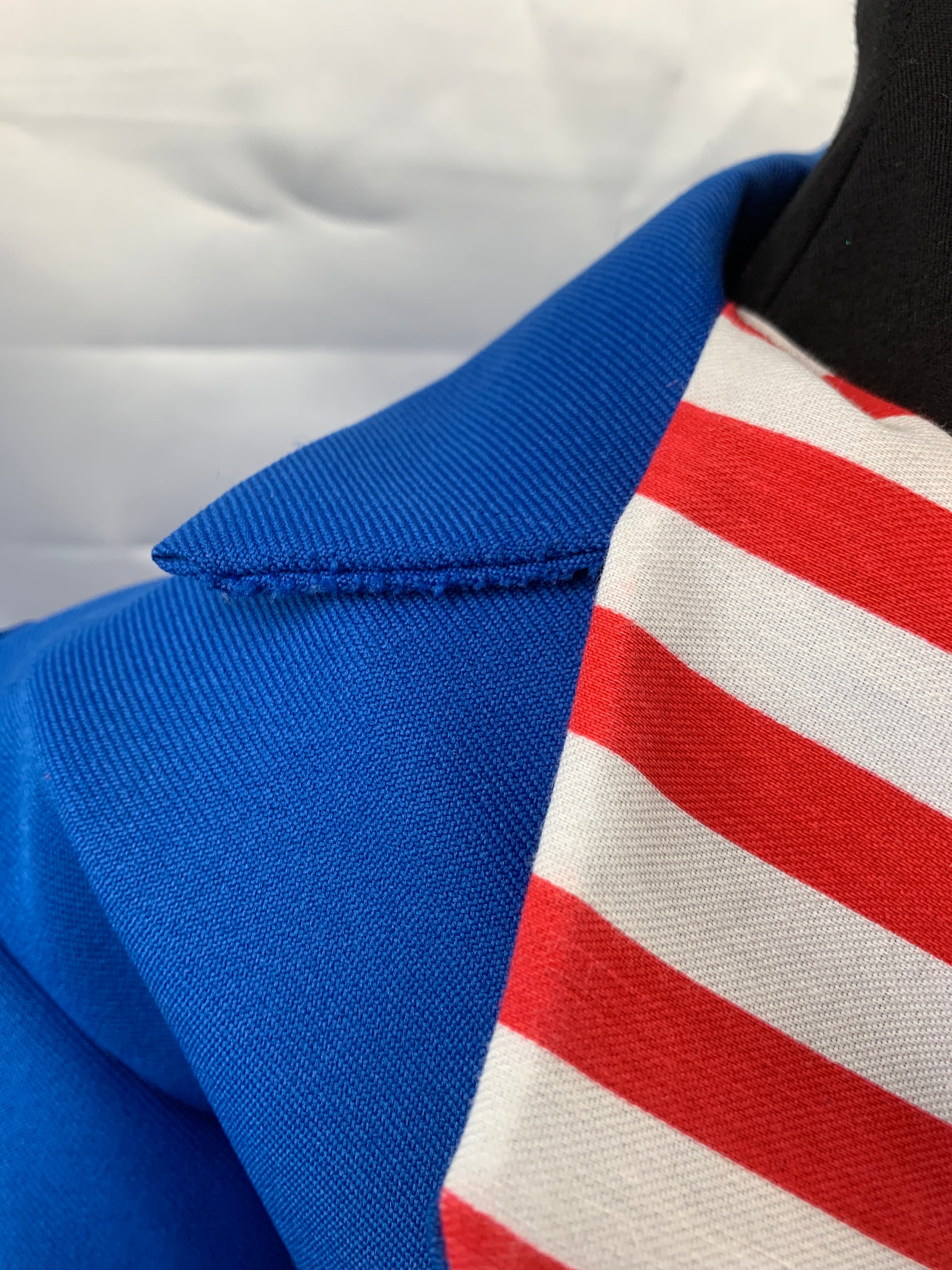 - Blue polyester blend tail coat with red and white striped pants and white shirt front