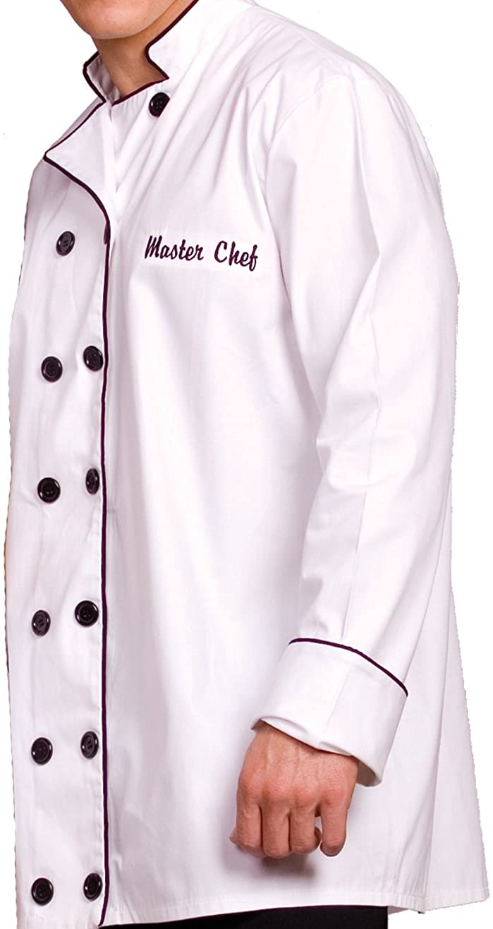 Cook up something delicious in this traditional Master Chef double breasted open front coat with decorative embroidery and classic chef hat.