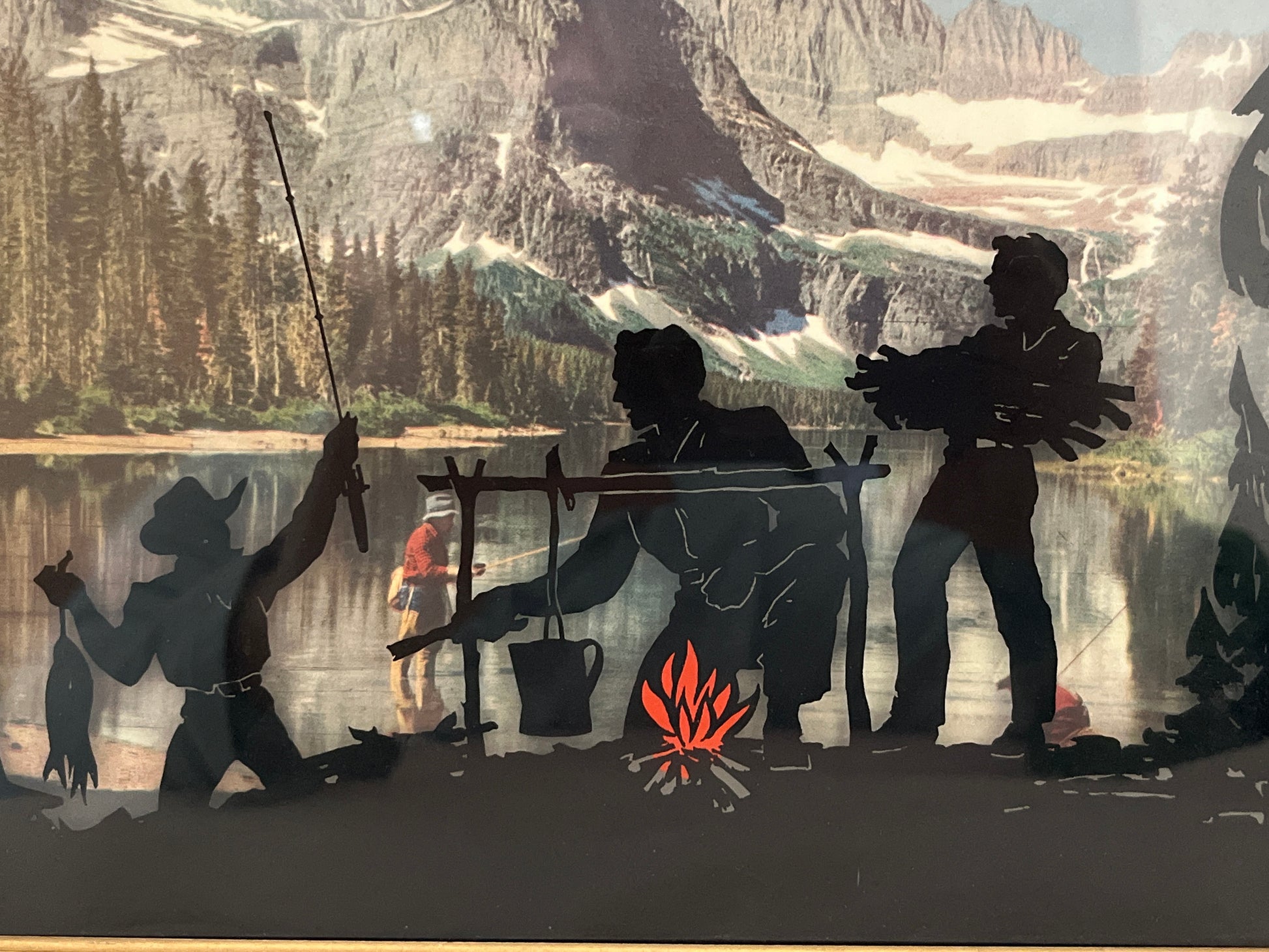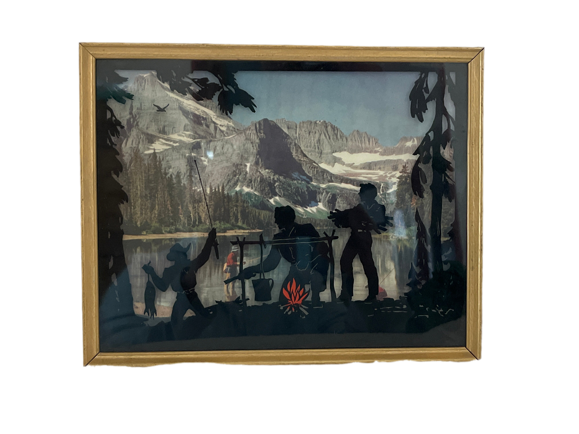 This vintage silhouette picture, from Miller Produce in Waseca, Minnesota. It Depicts a camping scene with three figures, one fishing, one tending to a fire, and one gathering wood |