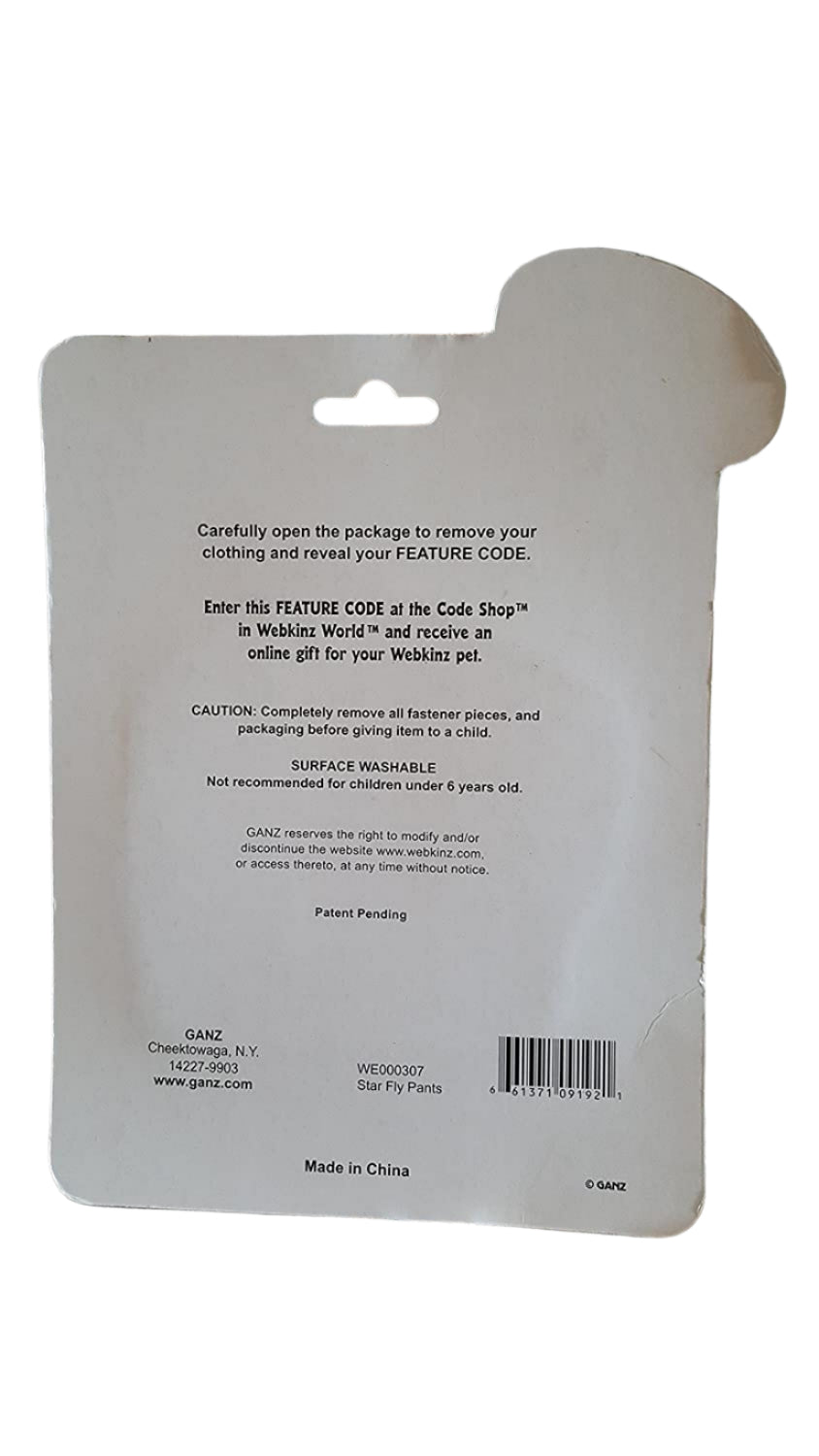 4.5 inch Webkinz Clothing Star Fly Pants by Ganz. This is the official Webkinz clothing line Star Fly Pants. The Star Fly Pants Webkinz Clothing is designed specifically to fit your Webkinz pet. As with all Webkinz Clothing the new Star Fly Pants come with a feature code to get an online prize for your online Webkinz World pet. The Webkinz Star Fly Pants clothing is a fun way to dress your favorite Webkinz stuffed animals. Be sure to check out the rest of the official Webkinz Clothes.